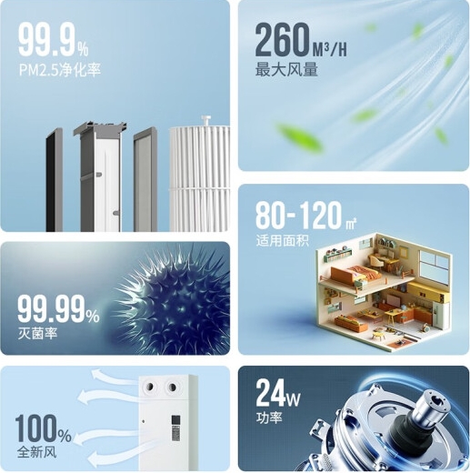 远大(BROAD)【官方直营】远大新风系统sq260全屋中央新风机双向流家用通风换气热交换吊顶除醛灭菌SQ260 SQ260(120平内适用)